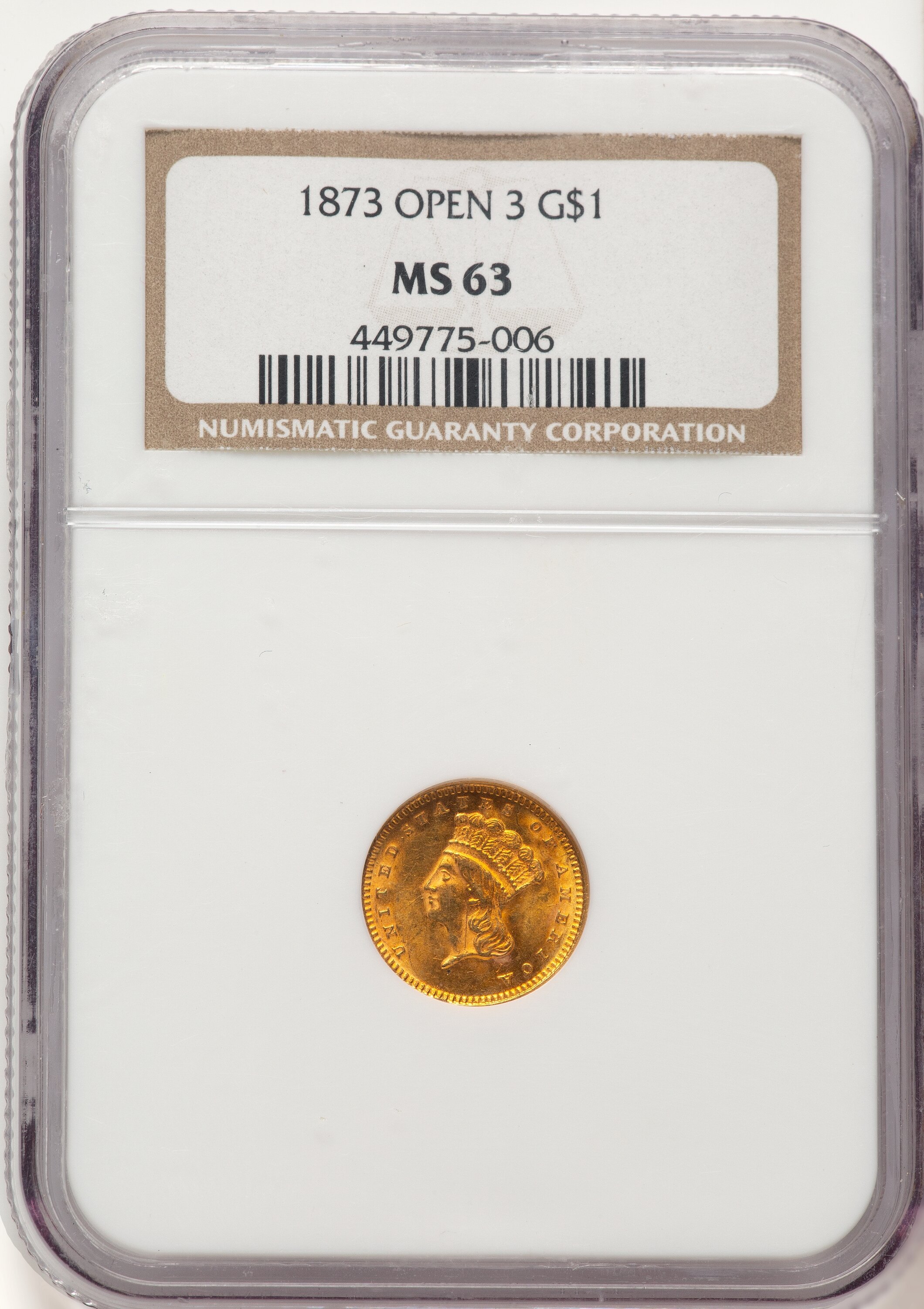 1873 G$1 OPEN 3, MS 63 NGC