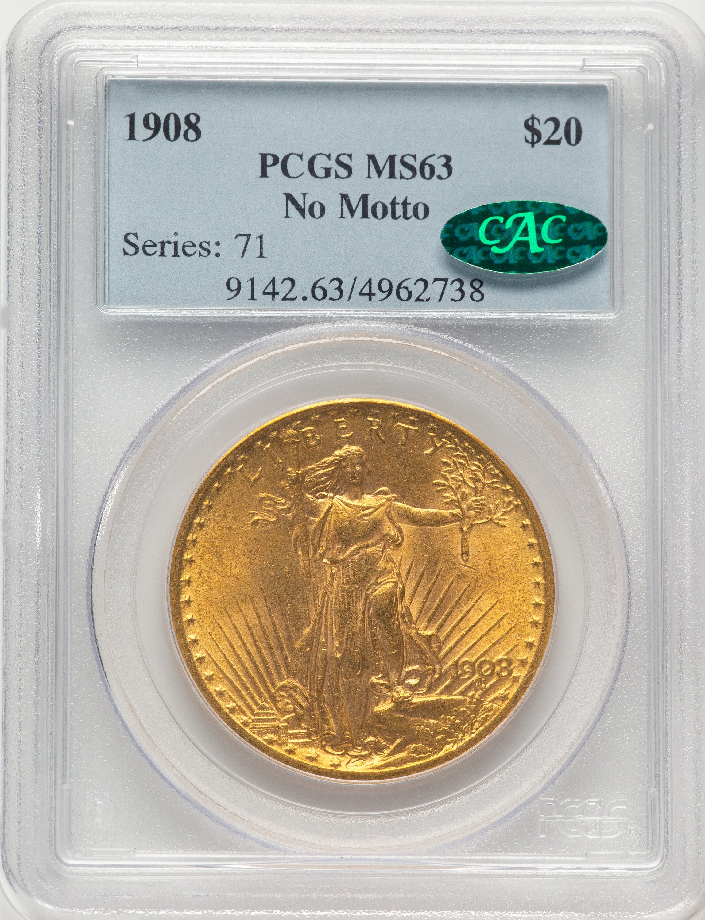 1908 $20 NO MOTTO CAC 63 PCGS